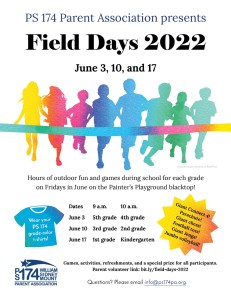 Wear your PS 174 grade-color t-shirts (to be distributed at school the day before each grade’s Field Day).