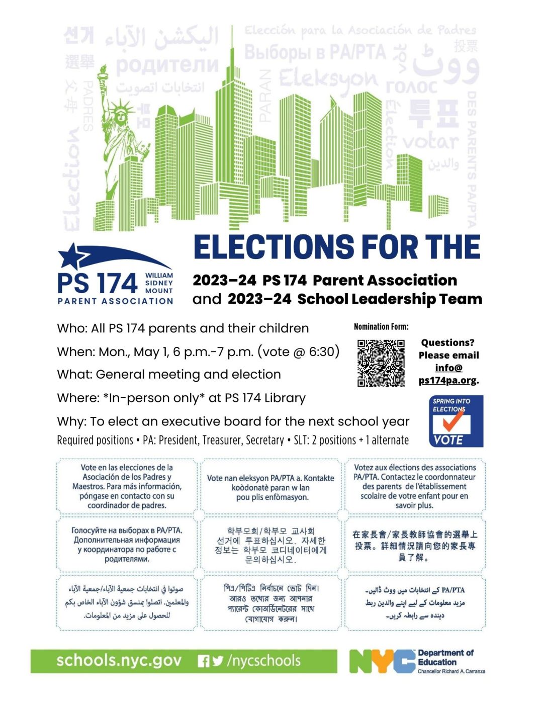 All Legal Guardians of students enrolled in PS 174 for the 2023–24 school year are eligible to run and to serve on the PA Board or SLT.