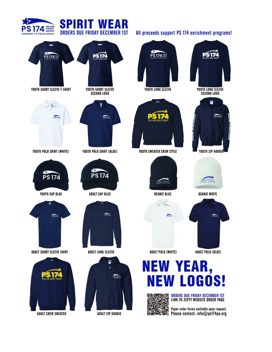 We are so excited to offer some new and exciting PS 174 gear to show your school spirit! Please place your order by Friday, December 1st. Your order will be sent home with your child the week of December 18th. All Items hand-printed/embroidered by a local vendor and friend of PS 174 right here in Queens, NY!