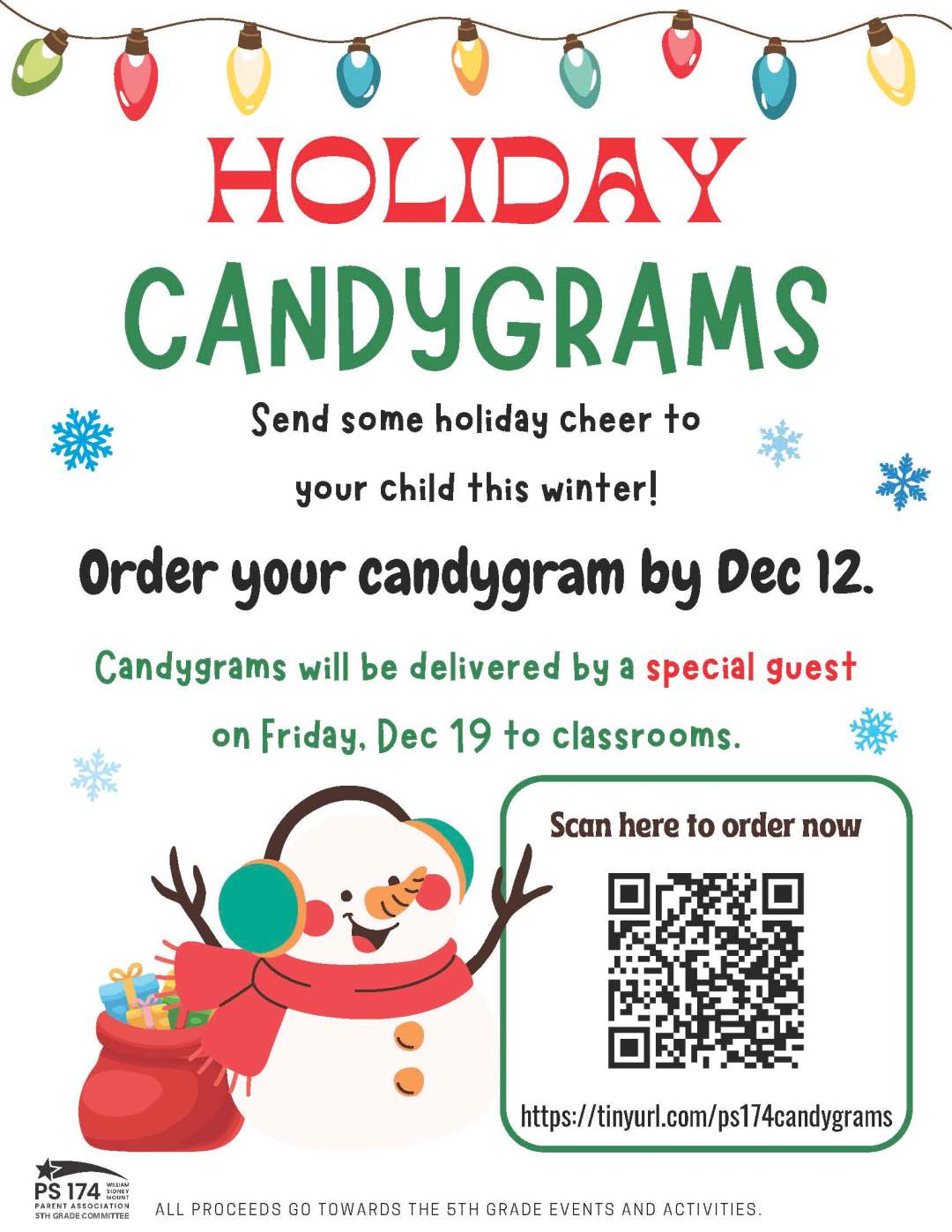 Candygrams will be delivered by a special guest on Friday, December 19 to classrooms.